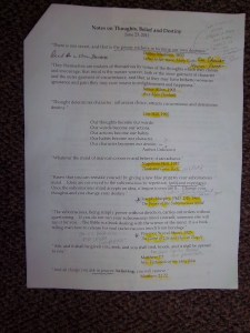 Page two further develops how such things may be accomplished. It is titled “Notes on Thoughts, Belief and Destiny.” My first reaction was to ask, ” Why is an exercise program delving into spiritual issues? As a Christian I can tell you that my discernment alarms clanged loudly at the following list of quotes.