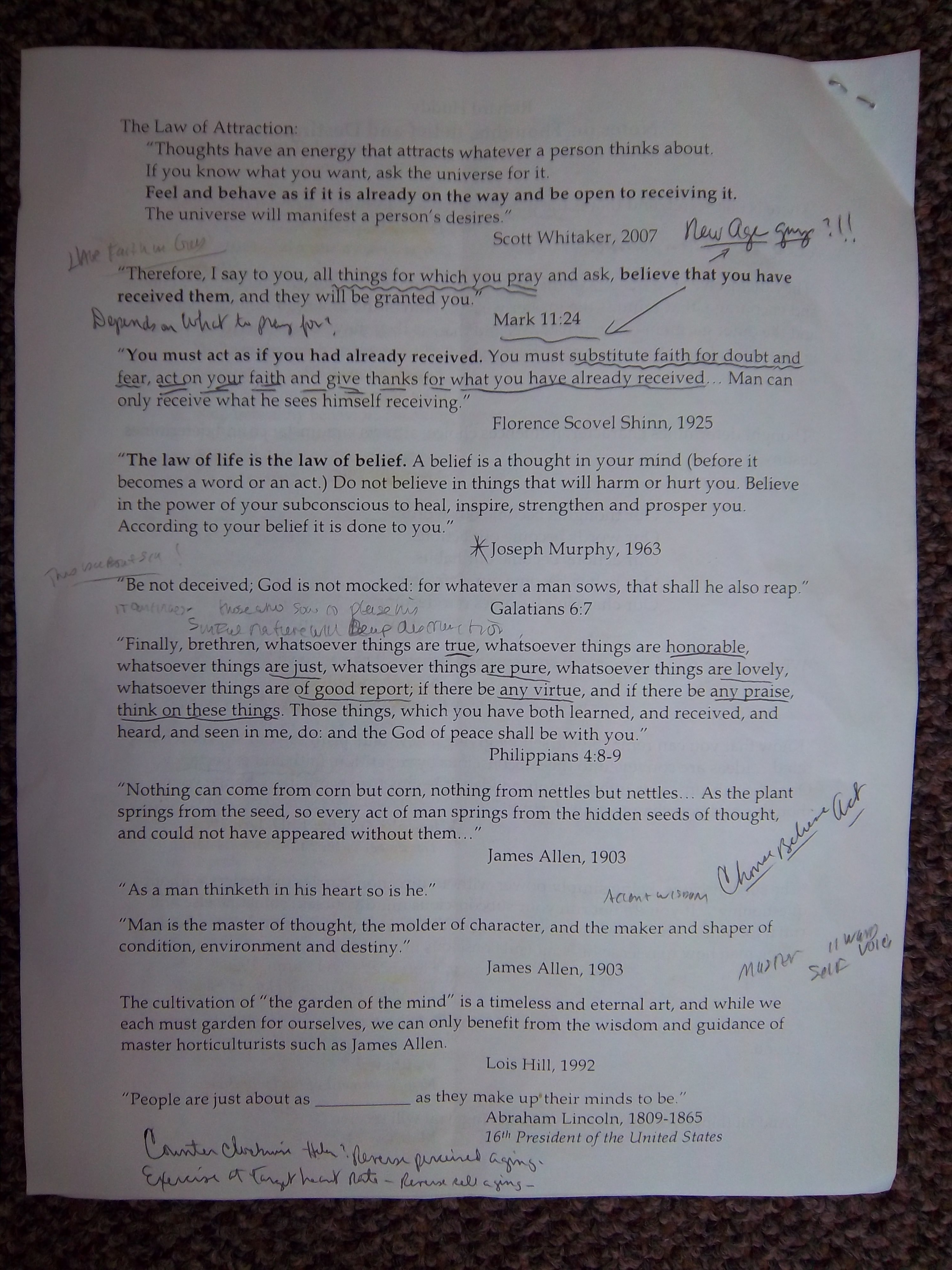 There are other quotes from James Allen, As A Man Thinketh, and Florence Scovel Shinn. Mixed in we have some scripture about prayer. The Bible verses just don’t fit in the New Age mix, and of course this is intentional for the new thinking involves finding your own truth. The thinking is that you can pick and choose whatever you happen to like at the moment and create your own religion and your very own God..which of course is…youself, because some entity has made you feel divine.