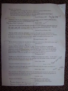 Page two further develops how such things may be accomplished. It is titled “Notes on Thoughts, Belief and Destiny.” My first reaction was to ask, ” Why is an exercise program delving into spiritual issues? As a Christian I can tell you that my discernment alarms clanged loudly at the following list of quotes.